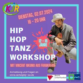 Im Rahmen der Regionalpartnerschaft des Bezirks Unterfranken und der Region Calvados in Frankreich hat der Kreisjugendring Schweinfurt einen besonderen Workshop im Programm: Am 02.07.2024 bietet Tanzlehrer Vincent Nkumu aus Frankreich einen HipHop-Workshop an. Beeinflusst wurde er vom HipHop sowie afrojamaikanischen Tanz.