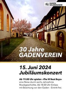 Der Gadenverein Geldersheim wurde vor 30 Jahren gegründet und aus diesem Anlass gibt es am Samstag, 15. Juni 2024 ein Open air Jubiläumskonzert mit der Band „The W Beat Boys“. Beginn ist um 19 Uhr vor den Gaden neben der Kirche, bei schlechtem Wetter in den Gaden. Einlass und Bewirtung ab 18 Uhr.