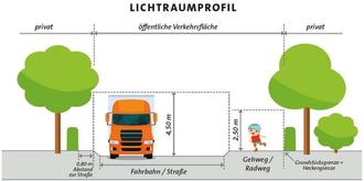 | • | Über die Fahrbahn ragende Äste und Zweige von Baumkronen oder Sträuchern sind so zurückzuschneiden, dass der Luftraum über der Straße mit einer lichten Höhe von 4,50 Meter über der Fahrbahn und den Straßenbanketten freigehalten wird. Dies stellt eine Durchfahrtshöhe für LKWs bzw. auch Rettungsfahrzeugen sicher. |