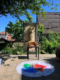 Am Sonntag, den 26.05.2024 fand eine gemeinsame Kinderkirche mit Bewohnern des Altenheims St. Martin statt. Zu dieser Kinderkirche hatten sich eine Vielzahl von Kindern und Senioren eingefunden, um einen gemeinsamen Gottesdienst mit Marienandacht bei der Schutzmantelmadonna im Außenbereich des Altenheims zu feiern. Zu Beginn der Kinderkirche durften die Kinder wieder von ihren schönen Erlebnissen seit der letzten gemeinsamen Kinderkirche erzählen und einen Muggelstein in die vorbereitete Kreismitte legen. Danach erfuhren sie etwas über Maria, die Mutter Jesus über ein gemeinsames szenisches Spiel mit Playmobilfiguren. Mit Liedern und Gebeten wurde ihrer gedacht und die Kinder erfuhren auch, dass der Monat Mai als Marienmonat besonders gefeiert wird und in manchen Gegenden am Ende des Monats sogar ein Fest zu ihren Ehren gefeiert wird. Aber nicht nur Senioren und Kinder nahmen diesmal am Kindergottesdienst teil, auch eine Nachbarskatze fand sich ein und beschäftigte sich ausgiebig mit den ausgelegten Muggelsteinen. Im Anschluss an die Kinderkirche bastelten die Kinder eine eigene Schutzmantelmadonna und erhielten vom Seniorenheim eine kleine Überraschung in Form von Seifenblasen. Vielen herzlichen Dank hierfür!