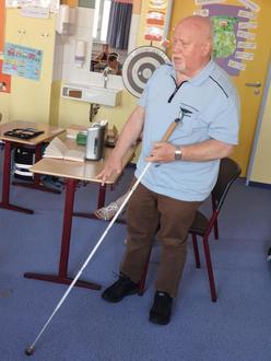 Herr Hennlich erzählte den interessierten Kindern, wie seine Augenkrankheit aufkam und wie sie immer weiter fortschritt. Die Schüler staunten nicht schlecht, als sie erfuhren, dass er im Alter von über 40 Jahren noch einmal in eine besondere Schule für Sehbehinderte gehen musste, um z.B. die Blindenschrift zu erlernen.