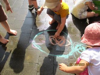 Das herrlich schöne Wetter lud zum Wasser planschen, Wasser spritzen, Wasserbomben werfen und ähnlichem ein. Auch Experimente mit Malkreide und Wasser fanden statt. Die Kinder konnten sich kreativ mit den Farben ausleben und gleichzeitig eine Abkühlung genießen. Alle hatten viel Freude dabei.