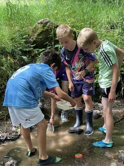 Am Dienstag standen bei herrlichem Sonnenschein die ersten Workshops auf dem Programm. Die Drittklässler bauten Boote, die sie anschließend unter großem Jubel auf dem Schwarzbach fahren ließen. Am Nachmittag fingen die Kinder im Bach auf dem Schullandheimgelände mit Sieb und Lupenbecher kleine Wassertierchen, die dann im Labor unter Mikroskopen erforscht und bestimmt werden konnten.
