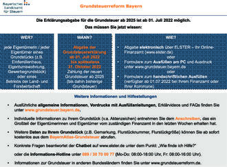 • Ausführliche Informationen der Bayerischen Vermessungsverwaltung zu den für die Grundsteuererklärung notwendigen Katasterdaten unter https://www.ldbv.bay-ern.de/produkte/grundsteuer.html