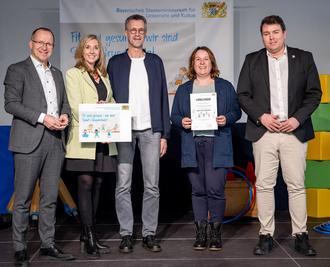 Von links: Präsident des Bayerischen Landes-Sportverbandes Jörg Ammon, Staatsministerin für Unterricht und Kultus Anna Stolz, Rektor Matthias Eichelsbacher, Lehrerin und Sportbeauftragte der Grundschule Geldersheim Nicole von den Bergen-Greß, Vorsitzender der Bayerischen Sportjugend Michael Weiß