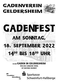 Das Geldersheimer Gadenfest hat seit Jahren Tradition und ist auch beliebt bei Wanderern und Radausflüglern. Es findet am Sonntag, den 18. September 2022 von 14.00 bis 18.00 Uhr statt. Wie jedes Jahr können Sie vor der malerischen Kulisse der Gaden in ruhiger Atmosphäre Kaffee und Kuchen oder auch Brotzeit mit Federweißen genießen. Bei schlechtem Wetter feiern wir in den Gaden. Beim Gadenfest haben Sie auch die Gelegenheit, die Fotoausstellung „Heimatliebe“ von Werner Enzinger in der Rubrik „Kunst aus Geldersheim“ zu betrachten.