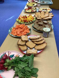 In der zweiten Schulwoche kündigte sich der ehrenamtliche Helfer und Schülervater Herr Rees bei uns in der Klasse an. Gemeinsam mit drei Müttern bereitete er in der ersten Schulstunde, während die Kinder noch fleißig lernten, ein gesundes Pausenfrühstück für die 1. Klasse zu. Als alle Vorbereitungen abgeschlossen waren, wurde in unserem Klassenzimmer ein leckeres Buffet aufgebaut. Zuerst erzählte Herr Rees den Kindern Interessantes zu gesunder Ernährung und regionalen Produkten.