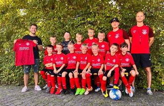 Neue Trikots für die U11 des 1. FC Geldersheim: Groß war die Freude bei den Jungs der U11, denn sie bekamen einen komplett neuen Trikotsatz in rot und schwarz, gesponsert von der Madinger GmbH. Beim 1. Mannschaftsfoto mit den neuen Trikots durften Sven Geyer, Geschäftsführer der Madinger GmbH (links im Bild), sowie die Trainer Danny Stubbe (hintere Reihe, 2. v. r.) und Andreas Klement (hintere Reihe ganz rechts) natürlich nicht fehlen.