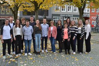 Im Bild, von links: Felix Reinwald, Eugen Melser, Rebecca Weber, Raphael Wigand, Moritz Albert, Julian Reuß, Laura Schöller, Fabian Kamm (Ausbildungsbeauftragter), stellv. Landrätin Bettina Bärmann, Laura Unsleber (Ausbildungsbeauftragte), Jessica Schillinger, Joy Reichert, Sara Weigand, Sophia Stark und Alisa Dütsch. Foto: Melina Bosbach/Landratsamt Schweinfurt