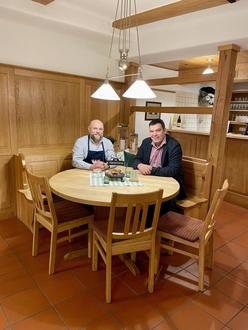 Von links nach rechts: Jens Wörner und Erster Bürgermeister Thomas Hemmerich sitzen gemütlich am Stammtisch im Fränkischen Hof zusammen.