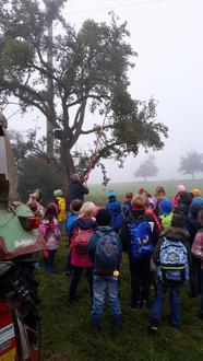 Am Freitag, den 6. Oktober fuhren die erste Klasse und die beiden zweiten Klassen nach Schleerieth zur Streuobstwiese. Im Ort begrüßte uns Herr Hederich und fuhr uns auf seinem Traktor zur Wiese voraus.