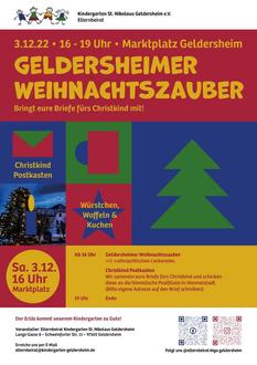 Der Elternbeirat des Kindergartens lädt am Samstag, 3.12. von 16 bis 19 Uhr zum Geldersheimer Weihnachtszauber auf dem Marktplatz ein.