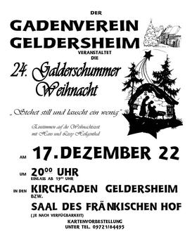 Am 17.12.2022 um 20 Uhr feiert der Gadenverein wieder seine traditionelle Galderschummer Weihacht. Zu Gast sind heuer Hans und Lissy Heilgenthal aus Gemünden-Hofstetten. Sie möchten ihre Zuhörer in dieser geschäftigen Zeit einladen, einmal auszuspannen und mit Klangzauber und Mundarttexten zu Ruhe und Besinnung zu kommen.