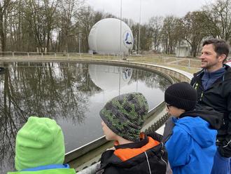 Auf den Faultürmen konnten die Kinder die gesamte Kläranlage von oben überblicken. Außerdem erfuhren sie, dass das in den Türmen entstehende Gas genutzt wird, um die Motoren der Anlage zu betreiben.