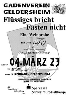 Unter dem Motto „Flüssiges bricht Fasten nicht“ (alte Klosterweisheit) lädt der Gadenverein Geldersheim dieses Jahr am 4. März um 20 Uhr in die Gaden Geldersheim zu einer Weinprobe ein. Zur Verkostung kommen ausgesuchte Weine vom Weingut Geßner aus Garstadt.