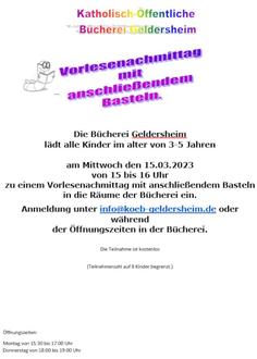 Die Bücherei Geldersheim lädt alle Kinder im alter von 3-5 Jahren am Mittwoch, den 15.03.2023 von 15 bis 16 Uhr zu einem Vorlesenachmittag mit anschließendem Basteln in die Räume der Bücherei ein.