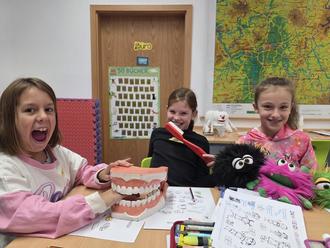 Um dem in Gammelsbach vorzubeugen, beschäftigte sich Klasse 3/4 einen ganzen Vormittag mit dem Thema Zähne. Hierzu kam Frau Setzer vom Gesundheitsamt mit einem prall gefüllten Trolli zu uns in die Schule. Gemeinsam sprachen wir zuerst über den Aufbau der Zähne, den Zahnwechsel, die Anzahl der Zähne und über die verschiedenen Zahntypen. Das gesunde Frühstück, aber auch Essen im Allgemeinen ist natürlich ganz wesentlich, wenn es um Zahngesundheit geht. Beim Thema Gebiss, Karies, Zahnstein hörte man einige „Bähs“ und „Auas“. Gerne würden wir uns all das ersparen. Und was man für gesunde Zähne tun kann kam natürlich direkt im Anschluss. Regelmäßiges und auch systematisches Putzen. Und wie das funktioniert durften wir dann alle ausprobieren. Vorher wurden die Zähne, bzw. der Mund eingefärbt. Speisereste und nicht gründlich gereinigte Stellen werden damit sofort sichtbar durch die blaue Farbe. Unter Anleitung putzen wir vor einem kleinen Handspiegel unsere Zähne. Und gemeinsam macht das natürlich gleich viel mehr Spaß.