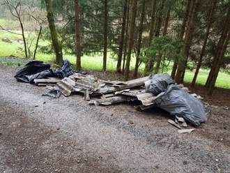 Zwischen Montagnachmittag 13.03.2023, 16:00 Uhr und Dienstagmorgen wurden im Wald oberhalb des Parkplatzes an der B 45, südlich des Camp Freienstein, Eternitplatten abgeladen.