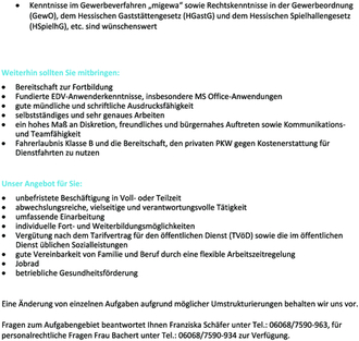 | • | Kenntnisse im Gewerbeverfahren „migewa“ sowie Rechtskenntnisse in der Gewerbeordnung (GewO), dem Hessischen Gaststättengesetz (HGastG) und dem Hessischen Spielhallengesetz (HSpielhG), etc. sind wünschenswert |