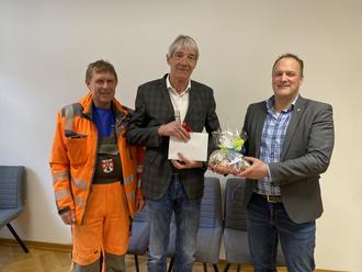 Bürgermeister Christian Kehrer (rechts) und Markus von der Au vom Personalrat (links) danken Peter Bauer (Mitte) für seinen jahrelangen Einsatz.