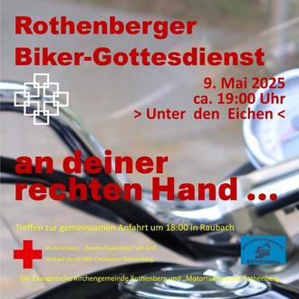 Zweiradfahrende, ob motorisiert und mit Muskelkraft angetrieben, treffen sich, um gemeinsam für eine friedliche und schadlose Saison zu beten. Die gemeinsame Anfahrt beginnt um 18.00 Uhr Parkplatz oberhalb der Raubach
