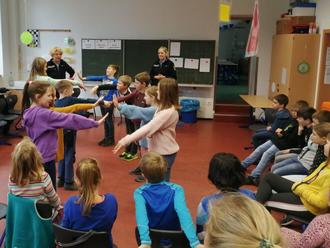 Außerdem wurden Tipps erarbeitet, um auch auf Fragen fremder Erwachsener angemessen zu reagieren. Wird ein Kind beispielsweise aus einem Auto heraus von einer fremden Person angesprochen, ist es wichtig, mindestens zwei Armlängen Abstand zu halten und in Richtung des Kofferraums wegzulaufen. Zu begreifen, dass Kinder auf die Fragen fremder Erwachsener gar nicht antworten müssen, fiel den meisten nicht leicht. Die beiden Sätze „Bitte fragen Sie einen Erwachsenen!“ oder „Lassen Sie mich in Ruhe!“ stellten dabei gerne angenommene Kompromisse dar, die im anschließenden Rollenspiel direkt eingeübt wurden. Des Weiteren wurde das Maskottchen Leon vorgestellt, dessen Bild an Schaufenstern die sogenannten „Hilfeinseln“ ersichtlich macht. Zum Schluss gab es für die Kinder noch zwei wichtige Hausausaufgaben. Zum einen sollten sie gemeinsam mit ihren Eltern eine „Positivliste“ erstellen, auf welcher die Namen der Personen geschrieben werden, mit denen die Kinder ohne Rücksprache mit den Eltern jederzeit mitfahren dürfen. Zum anderen sollten sie mindestens eine Handynummer einer vertrauten Person auswendig lernen. Der kurze Unmut, der sich wegen der beiden Aufgaben unter den Schülern breit machte, war bei der Aussicht, gleich in ein echtes Polizeiauto schauen zu dürfen, schnell vergessen. Und so schloss der informative und kurzweilige Vormittag mit einem echten Highlight ab.