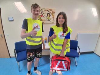 „Schulsanitätsdienst bedeutet für mich, an der Schule zu helfen und die Schülerinnen und Schüler zu unterstützen. Wir wollen gerne den Menschen helfen und Neues lernen. Die Ausbildung bei Herrn Knecht war aufregend, spannend und wir haben viele neue interessante Sachen gelernt.“ Sofia Haas, Christian Lutz