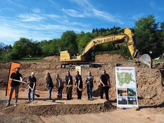 Freudige Gesichter beim Spatenstich v.l.n.r.: Tiago Moura und Dominic Hewitt (Moha+architektur), Tina Mühlfeld (Leitung Bauverwaltung Stadt Oberzent), Katharina Riesinger (Vorsitzende des Bau-, Umwelt- und Infrastrukturausschuss Stadt Oberzent), Timo Bauer (1. Vorsitzender FF Airlenbach), Jens Bärwolf (Wehrführer FF Airlenbach), Bürgermeister Christian Kehrer und Marc Johe (Stadtbrandinspektor).