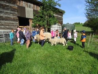 Im Anschluss gingen wir zum Stall, dort konnten die Kinder ein Lamm mit der Flasche füttern, den Schafen Brot geben und sie auch streicheln. Nachdem die Tiere gefüttert waren, überraschte uns Familie Pollmann mit einem reichhaltigen gesunden Frühstück. Das große Grundstück lud zum Spielen ein. Die Kinder hatten viel Spaß dabei. Es gab ein Bastelangebot mit echter Schafswolle das die Familie Pollmann vorbereitet hatte. Als Highlight wurde eine Hüpfburg aufgeblasen und Frau Pollmann zeigte den Kindern das Baumhaus. Für die Kinder war es ein unvergessliches Erlebnis, das ihnen noch lange in Erinnerung bleiben wird.