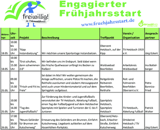 Die Ehrenamtsagentur des Odenwaldkreises bietet auch in diesem Jahr die Mitmachaktion „Engagierter Frühjahrsstart“ an. Viele Vereine und Organisationen haben das Angebot aufgegriffen und Projekt geplant. Haben Sie Lust mitzumachen und sich zu engagieren? Dann kommen Sie einfach vorbei oder melden Ihre Teilnahme über https://www.fruehjahrsstart.de an. Dort können Sie sich auch über die Projekte informieren oder ein Projekt anmelden. In Oberzent werden folgende Projekte durchgeführt (Anmeldestand 14.05.2024):