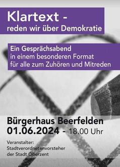 Am 1. Juni 2024 um 18:00 Uhr lädt der Stadtverordnetenvorsteher Dirk Daniel Zucht der Stadt Oberzent zu einem besonderen Gesprächsabend im Bürgerhaus Beerfelden, Singsaal ein. Unter dem Titel "Klartext - reden wir über Demokratie" wird ein spannendes Format angeboten, das allen Interessierten die Möglichkeit gibt, zuzuhören und/oder mitzureden. Nutzen Sie die Gelegenheit, sich aktiv an Diskussionen über die Bedeutung und Zukunft unserer Demokratie zu beteiligen und verschiedene Perspektiven kennenzulernen.