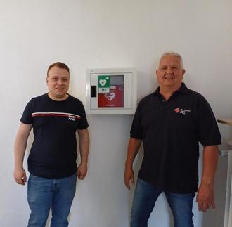 Foto: Ortsvorsteher Rico Scheuermann und Vorsitzender des DRK Beerfelden Joachim Zimmermann am Defibrillator im Bürgerhaus