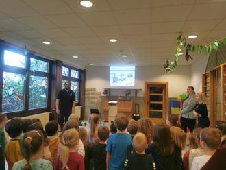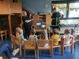 Aufmerksame Zuhörer bei der Brandschutzerziehung - Steffen, Ann-Kathrin und Marah von der Feuerwehr zeigen den Kindern wie man richtig im Brandfall reagiert