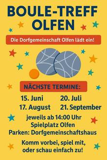 Nach dem gelungenen Auftakt am 18. Mai geht der Boule-Treff der Dorfgemeinschaft Olfen in die Verlängerung! Die Bahn auf dem Spielplatz Olfen wird auch in den kommenden Monaten regelmäßig zum Treffpunkt für Spiel, Spaß und Geselligkeit.