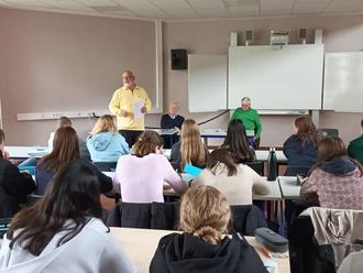 Unter anderem erklärten sie uns, was das Grundgesetz ist und, dass es bald 75 Jahre alt wird. Sie sagten uns, dass es aktuell eine Tendenz gebe, dass viel weniger Länder die Demokratie befürworten. Wir führten Diskussionen über verschiedene Themen der Demokratie in Deutschland, wie zum Beispiel, ob wir glauben, dass es in 10 Jahren noch eine Demokratie geben wird. Sie erklärten uns, dass es nicht selbst verständlich sei, in einer Demokratie zu leben. Am Ende gab es noch eine offene Fragerunde. Wir fanden es sehr aufschlussreich und interessant und bedankten uns für den Besuch.
