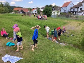Am 12.06.24 unternahmen die 4–5-jährigen Kinder aus der evangelischen Kindertagesstätte einen Ausflug nach Etzean. Knapp 32 Kinder liefen um 8:30 Uhr voller Aufregung los. Nach ca. einer halben Stunde laufen setzten wir uns ins frisch gemähte Gras zum Frühstücken. Nach dem Frühstück teilten wir die Kinder für unsere Wald & Wiesen Rallye in zwei Gruppen auf. Damit der Weg nach Etzean erlebnisreich und nicht langweilig wurde, durften die Kinder verschiedene Utensilien aus dem Wald einsammeln (Tannenzapfen, Farn, Blumen, Baumrinde und vieles mehr). Unterwegs gab es auch viele verschiedene Tiere zu sehen. Sogar die abgestreifte Haut einer Blindschleiche haben wir entdeckt. Am Ziel angekommen konnten beide Gruppen aus den gesammelten Materialien ein Waldmandala erstellen. Im Anschuss durften die Kinder im Freispiel den Spielplatz erkunden. Als Highlight diente der Bachlauf. Dieser wurde direkt als kühle Erfrischung für die Füße genutzt. Als Stärkung gab es ein Picknick auf der Wiese. Beim Spielen mit dem Schwungtuch kamen die Kinder auf verschiedene Ideen und hatten eine Menge Spaß. Ein gemeinsamer Abschlusskreis rundete den Ausflug ab und die Kinder wurden von ihren Eltern abgeholt.