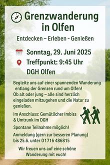 Zur zweiten Grenzwanderung lädt der Ortsbeirat Olfen am Sonntag, den 29.06.2025, ein. Treffpunkt ist um 9:45 Uhr vorm Dorfgemeinschaftshaus in Olfen. Von dort aus geht die Wanderung zur Begehung eines weiteren Teils der Grenze um ca. 10:00 Uhr los.