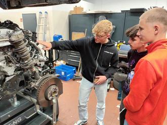 Zuerst wurden wir in die Direktannahme geführt. In der Direktannahme werden die Autos von Service Fachkräften auf die Schadenshöhe geprüft. Der Serviceleiter in Erbach heißt Gerd Meister. Danach wurden wir in die Werkstatt geführt. Die Werkstatt wurde wie das restliche Gebäude 2017 komplett erneuert und vergrößert. Uns wurde ein ausgebautes Getriebe mit Vorderachse gezeigt, das momentan repariert wurde. Das Getriebe wurde mithilfe einer extra dafür gekauften Hebebühne ausgebaut und gehalten. Uns wurde ein Auto mit einem Neupreis von 80 000 Euro gezeigt, welches einen Schaden in Höhe von 22 000 Euro hat. Frau Müller hat uns erzählt, dass früher 80% der Kunden ihre Autos geleased haben. Diese Zahl ist wegen Corona stark gesunken. Manche Kunden kaufen ihre Autos auch bar. Danach hat Frau Müller uns die Waschanlage gezeigt, die auch 2017 erneuert wurde. Früher hatte das Autohaus auch eine eigene Lackiererei. Die Lackiererei wurde aber geschlossen, da nicht so viele Autos neu lackiert werden mussten. Die Autos werden jetzt von einer anderen Lackiererei lackiert. In dem Gebäude in dem früher die Lackiererei drin war befindet sich heute das Reifenlager. Die Reifen werden in einem dreistöckigen Regal gelagert. Das Lagersystem kommt aus Schweden. In diesem Lagersystem werden die Reifen mithilfe einer Maschine eingelagert. In diesem Gebäude befindet sich auch eine Reifenwaschanlage. Danach waren wir fertig und sind noch mal alle zusammen zur Info gegangen, wo wir unsere Sachen abgestellt hatten. Dann verabschiedeten wir uns von Frau Müller und fuhren mit Bus und Bahn zurück an die Oberzent-Schule.