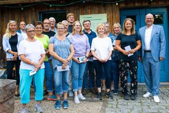 Bei bestem Wetter übergab Erster Kreisbeigeordneter Oliver Grobeis am Mittwochabend (28. Juni) unter freiem Himmel vor dem Pumpenhäuschen Rothenberg Ehrenamts-Cards an engagierte Bürgerinnen und Bürger. Gastgeber war der Verkehrs- und Verschönerungsverein Rothenberg, der den Gästen zu Beginn Wissenswertes über die Wasserpumpe und die Aktivitäten des Vereins vermittelte. Dafür wurde die Pumpe, die es in Deutschland nur noch ein weiteres Mal in einem Museum gibt, in Betrieb genommen. Den offiziellen Teil der Veranstaltung leitete dann der Männergesangverein 1911 Rothenberg musikalisch ein.