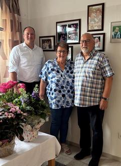 Unter den zahlreichen Gratulanten aus Familie, Nachbarschaft und Freunden war auch Bürgermeister Christian Kehrer (Foto links), der dem Jubelpaar die Glückwünsche im Namen der Stadt Oberzent und die Glückwunschurkunde des Hessischen Ministerpräsidenten überbrachte.
