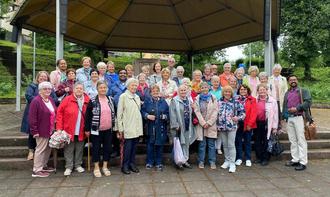 Beim gemeinsamen Foto musste man sich dann schon beeilen, denn es begann zu regnen. Bis zur Abfahrt des Busses wollte man jetzt noch Kaffee und Kuchen und Eis in einem schönen Café genießen, das man mit immer schnellerem Schritt dann bei heftigem Regen ziemlich nass erreichte.