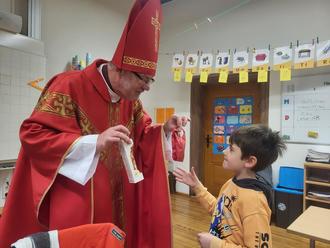 Was eine Überraschung! Am Freitag, den 6. Dezember bekamen wir Besuch: Pfarrer Frohmuth kam vorbei. Er erzählte uns von dem großen Kinderfreund Nikolaus von Myra. Und während seiner Erzählung verwandelte er sich nach und nach in diesen Nikolaus. Das Unterhemd, das Gewand, den Hut und den Stab. Alles hatte er dabei. Den Symbolcharakter der Farben hat er uns erklärt und am Ende hat er allen einen Schokoladennikolaus und ein Nikolaustütchen geschenkt. Einzeln rief er die Kinder zu sich, die sich sehr über die Geschenke freuten. Wir haben uns über das Wiedersehen ganz arg gefreut. Und die wichtigste Frage der Kinder zum Abschied lautete: Wann kommst du wieder zu uns, Pfarrer Frohmuth?