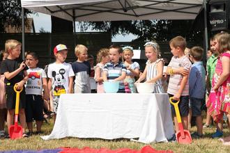 Bei herrlichem Wetter eröffneten die Kinder der Evangelischen Kindertagesstätte mit Pfarrer Frohmuth und dem Posaunenchor das neue Gemeindefest unter dem Motto