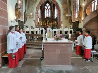 Am Sonntag, den 21. Juli, feierten wir das Fest „Unserer Lieben Frau auf dem Berge Karmel“ mit einem feierlichen Festgottesdienst zum 15. Mal in der Klosterkirche Hirschhorn. Zelebrant war Dr. Sebastian Lang, Generalvikar aus Mainz. Dabei waren auch 8 Patres, die meisten waren der Gemeinde sehr vertraut, auch wenn sie nun in anderen Teilen des Bistums tätig sind. Gedankt wurde auch Pater Valsan, der uns in der Gemeinde die letzten 2 Jahre eine große Unterstützung war, er wird uns zum 1. August verlassen und nach Straubing, Bistum Regensburg, wechseln. Wir werden ihn mit seiner angenehmen Art vermissen und wünschen ihm für die Zukunft alles Gute. Wir freuen uns, wenn auch er immer mal wieder ins Neckartal zurückfindet. Zum Festgottesdienst waren auch wieder einige Gäste aus Bad Wimpfen zu Besuch, hier merkt man, wie sehr man zusammenwächst, dass wir einen Pastoralraum präsentieren. Die KKM rundete das Ganze festlich ab. Nach dem Gottesdienst ging es gemeinsam zum Empfang und Umtrunk in den Klosterhof, wo man sich bei Spundekäs und Brezeln und Klosterbier oder Wein, in nette Gespräche vertiefte. Auch das Wetter war uns wohlgesinnt, zwischendurch sah es doch mal nach Regen aussah. Rundum war es ein schönes Fest und wir bedanken uns bei allen, die dazu beigetragen haben.