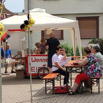 Auf dem Foto: Ortsbeiräte Anna Zucht, Wolfgang Schwöbel und Horst Kowarsch beim Eisverkauf, sowie Ursula Bergmann und Elisabeth Bühler-Kowarsch in Bürgergesprächen.