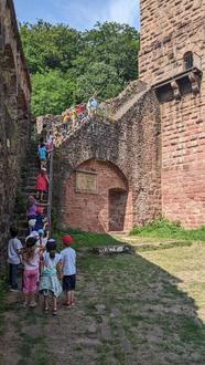 Am letzten Tag der Waldwoche starteten wir erstmals fernab der Kita in Hirschhorn. Dort fuhren wir vom Bahnhof aus mit dem Zug nach Neckarsteinach. Hier konnten wir sowohl eine Schleuse im Neckar erkunden als auch einen Bergfried besteigen. Weil wir bei erneut heißen Temperaturen diesmal keine Bademöglichkeit hatten, kühlten wir uns mit einem Eis ab.