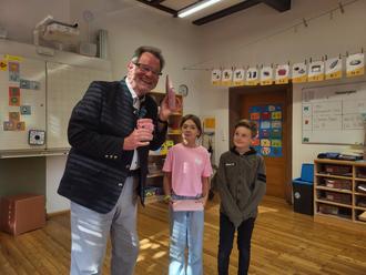 Es war schon ein wenig traurig, als Pfarrer Frohmuth das letzte Mal als Religionslehrer in den Klassenraum kam. Natürlich waren wir alle darauf vorbereitet, denn schon am Schulfest haben die SchülerInnen Herrn Frohmuth zum Abschied ein Schul-T-Shirt überreicht. Dieses wurde in den letzten Tagen noch liebevoll signiert und konnte nun endgültig überreicht werden. Außerdem schenkten die Schulsprecher im Namen aller Mitschüler Pfarrer Frohmuth ein Freundebuch. Alle haben sie sich in den vergangenen Wochen darin verewigt. So kann Herr Frohmuth in Sehnsuchtsmomenten das Buch zur Hand nehmen und an uns denken.