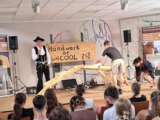 Am Montag, den 23.06.2025, war Richard Betz mit seinem Stück „Hand und Werk – Handwerk ist un(cool)?!“ an unserer Schule, um die Schüler/innen des 8. und 9. Jahrgangs schauspielerisch auf seine Suche nach dem Sinn des Lebens und der „richtigen“ beruflichen Entscheidung mitzunehmen. Dabei erzählte Betz auf witzige und ehrliche Art von seinem Weg als Zimmerer, Architekt und Schauspieler und baute dabei ganz nebenbei eine Brücke aus Holz auf, die die Schüler auch besteigen und aufbauen konnten. Die Botschaft des Solostücks wurde deutlich: Finde deinen eigenen Weg und triff Entscheidungen. Denn keine Entscheidung zu treffen ist wie eine falsche Entscheidung. Organisiert und unterstützt wurde diese Aktion von der Kreishandwerkerschaft Odenwald, der Handwerkskammer Odenwald und der Sparkasse Odenwaldkreis. Die Ausbildungsbotschafterin Frau Marion Ludwig rundete die Veranstaltung ab, indem sie einen Überblick über Handwerksberufe und Berufsbilder gab und auf wichtige Anlaufstellen und Informationen bei der Berufswahl hinwies.