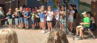 Mit einem kunterbunten musikalischen Programm, bei dem alle Klassen mitwirkten, wurden am letzten Schultag die Viertklässler verabschiedet und die Sommerferien eingeläutet. Viele Gäste waren zum Feriensingen gekommen und vom Förderverein wurde sogar für alle Besucher ein Eis serviert. Ein ganz herzlicher Dank gilt Herrn Palmer, der die Tontechnik professionell ausgeführt hat.