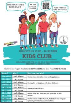 Die Jugendpflege Oberzent ist schon ganz gespannt und freut sich riesig, euch nach der Sommerpause wieder mit bunten und aufregenden Angeboten begeistern zu können! Der neue Flyer für unseren Kids Club ist nun erhältlich. Freut euch auf wöchentliche, kreative Projekte und jede Menge Spiel und Spaß.